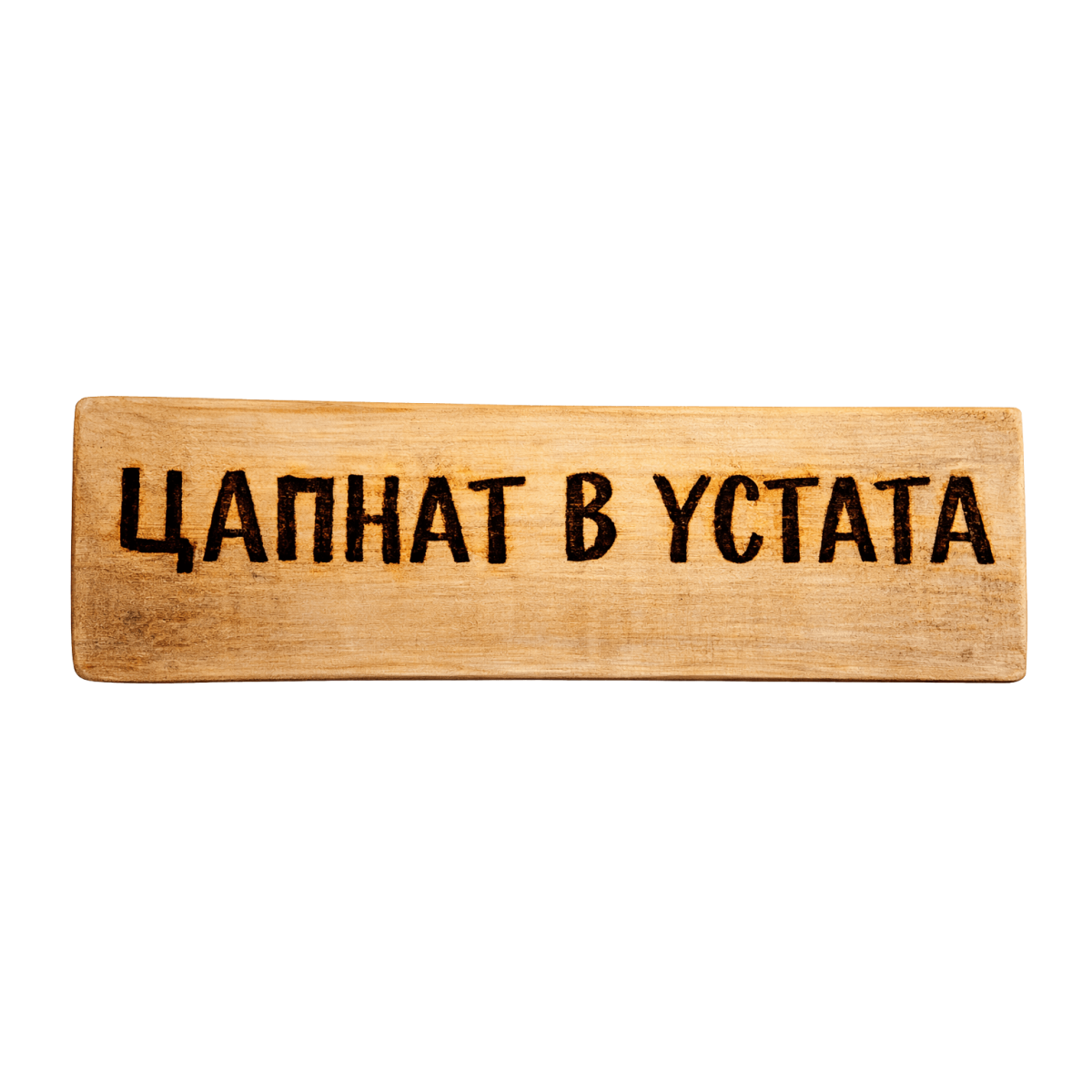 Ръчно изработена дървена табела с надпис „Цапнат в устата“ – за хора, които не подбират думите, а казват нещата директно. Перфектен акцент за дом с характер и чувство за самоирония.