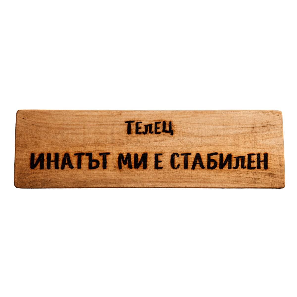 Ръчно изработена дървена табела за зодия Телец с надпис „Инaтът ми е стабилен“ – закачливо мото, което отразява упоритостта, постоянството и твърдия характер на този знак. Оригинален подарък и декорация за личности с търпение, упоритост и характер, който трудно се разклаща.
