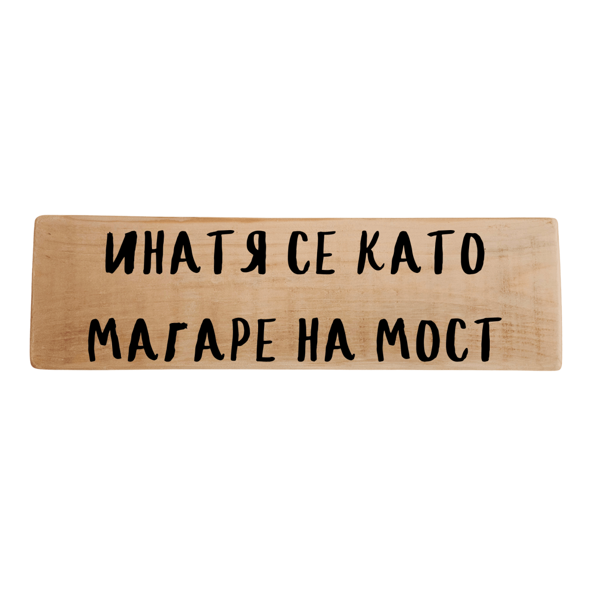 Ръчно изработена табела с надпис „Инатя се като магаре на мост“ – класически народен лаф за хора, които като кажат „не“, значи „не“ и толкова. Подходяща е за дома, офиса или работното място и носи настроение с хумор и чиста истина.