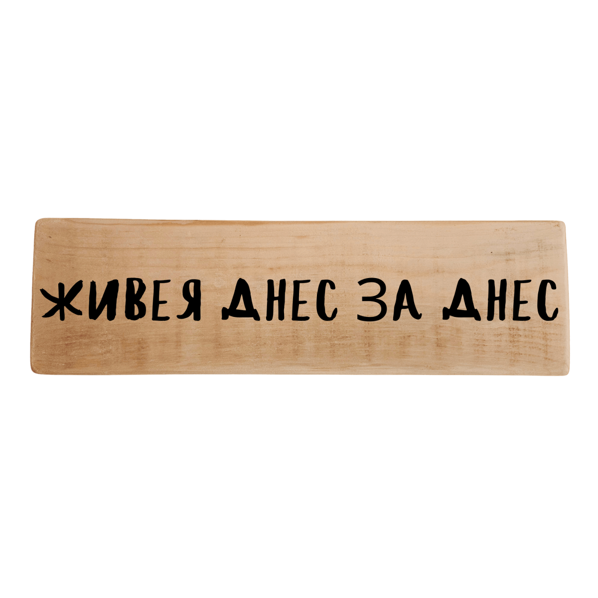 Ръчно изработена табела с надпис „Живея днес за днес“ – позитивно и вдъхновяващо послание за хора, които не отлагат живота и умеят да се радват на момента. Подходяща е за дома, офиса или кът за почивка и придава лекота и настроение на всяко пространство.