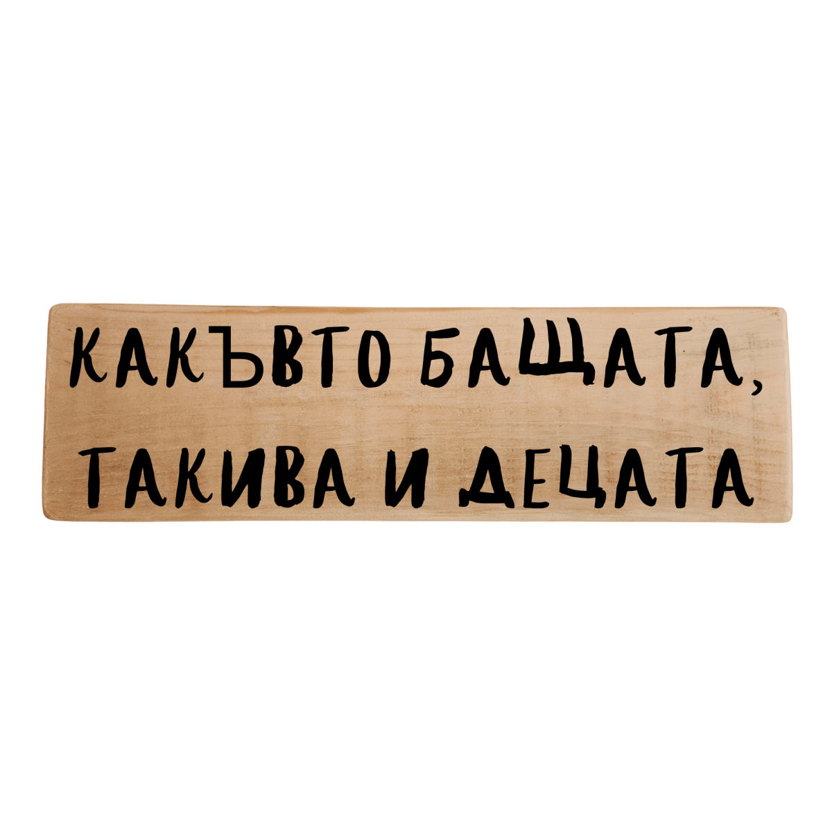 Ръчно изработена табела с надпис „Какъвто бащата, такива и децата“ – народна мъдрост, която напомня колко важен е примерът в семейството. Подходяща е за дома, кухнята или семейния кът и носи смислено послание, което остава.