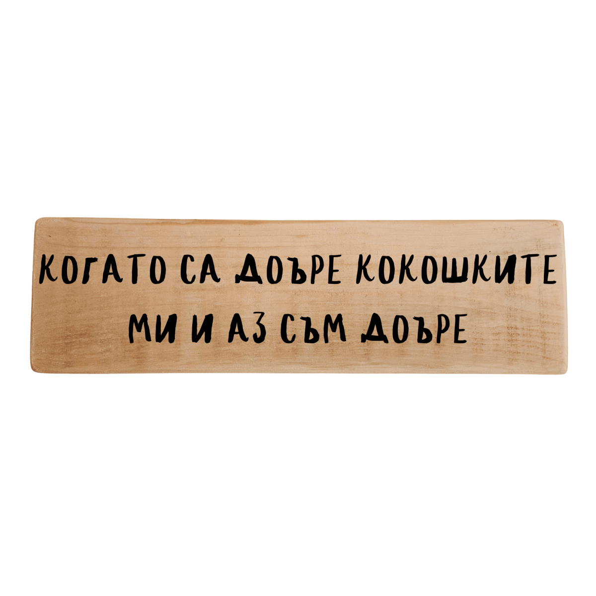 Табела „Когато са добре кокошките ми и аз съм добре“ е забавен и топъл начин да покажеш любовта към живота, спокойствието и малките радости. С чувство за хумор и леко намигване, тя напомня, че доброто настроение идва от простите и познати неща. Ръчно изработена от дърво, табелата е чудесен акцент за дома, градината или кът за почивка, идеален подарък за любим човек, който цени шегата и уютния живот.
