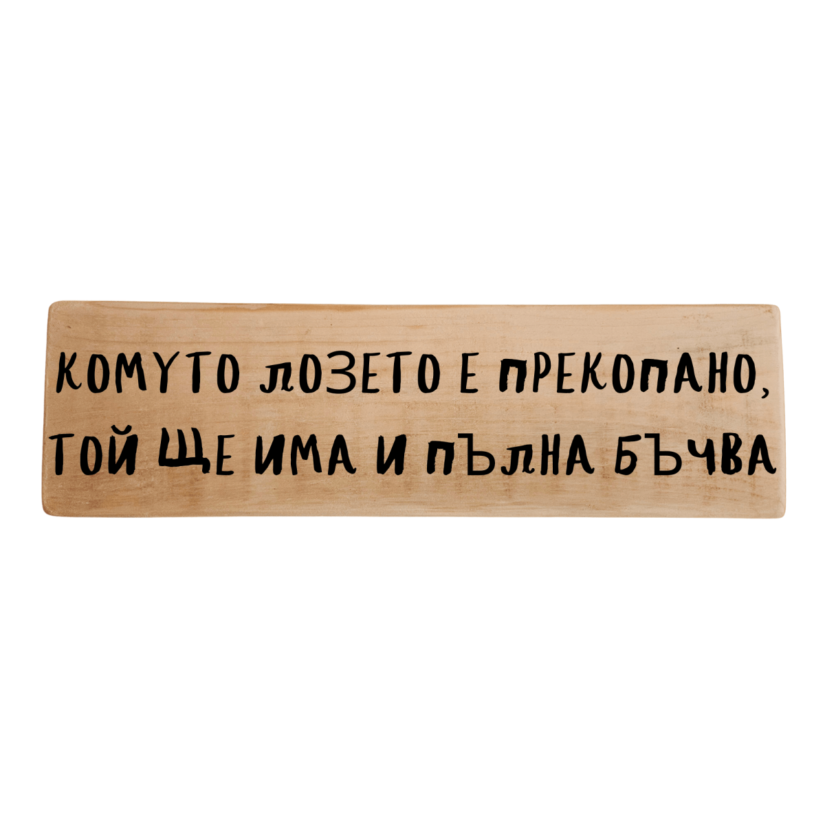 Табела „Комуто лозето е прекопано, той ще има и пълна бъчва“ носи ясното и мъдро послание, че трудът винаги се отплаща. С топлина и народна мъдрост тя напомня, че грижата, постоянството и усилията водят до изобилие и удовлетворение. Ръчно изработена от дърво, табелата е подходящ акцент за дома, двора, избата или лозето и е чудесен подарък за човек, който цени труда, традициите и плодовете на добре свършената работа.