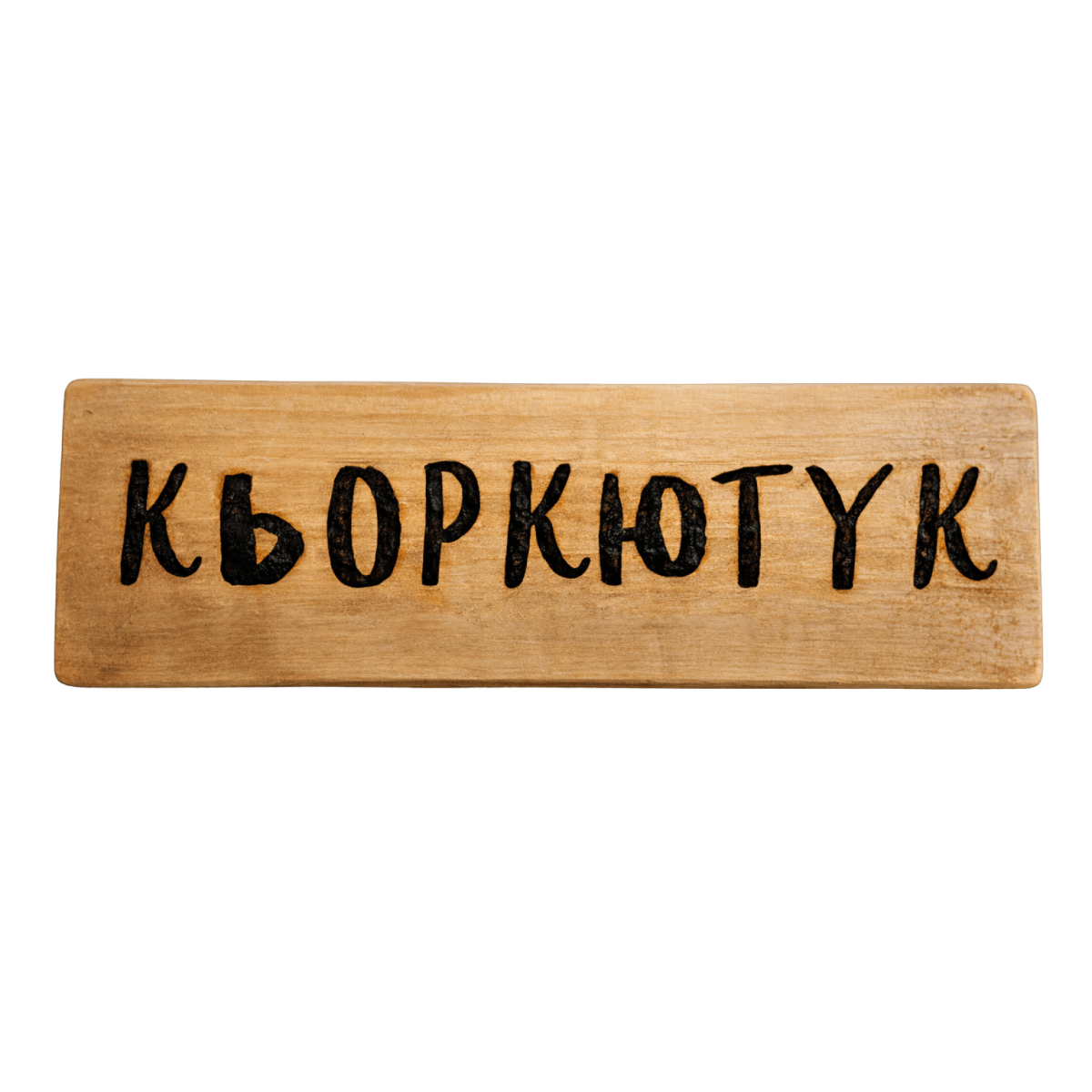 Ръчно изработена табела с надпис „Кьоркютук“ – кратък, ударен и много забавен надпис с типично български хумор. Идеален е за механа кът, лятна кухня или място за компания, където настроението винаги е на ниво.