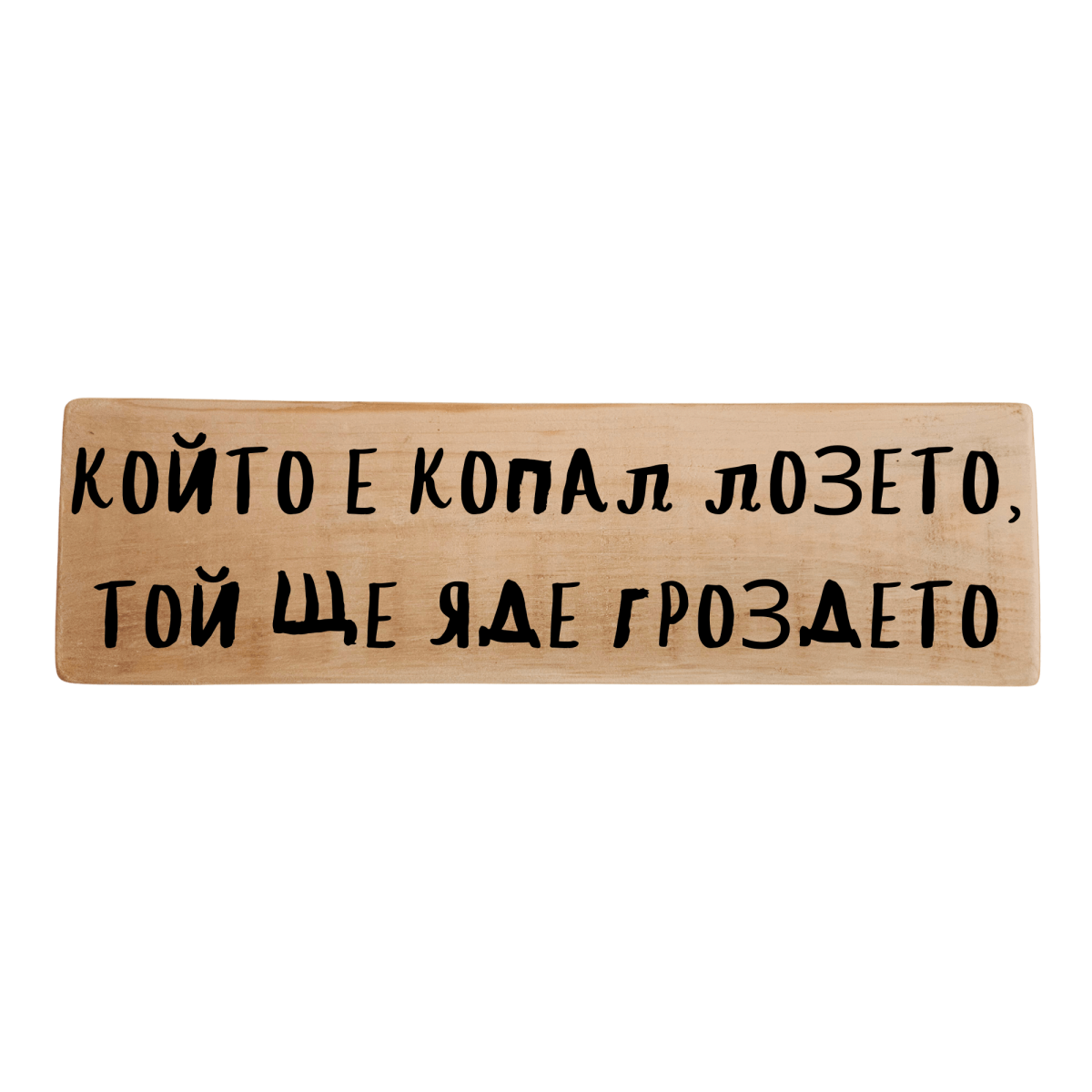 Табела „Който е копал лозето, той ще яде гроздето“ е забавен и мъдър начин да покажеш, че усилията винаги се възнаграждават. С леко намигване и чувство за хумор, тя напомня, че трудът носи сладки резултати – във всяко отношение. Ръчно изработена от дърво, табелата е чудесен акцент за дома, градината или кът за почивка, идеален подарък за любим човек, който обича традициите и шегата.
