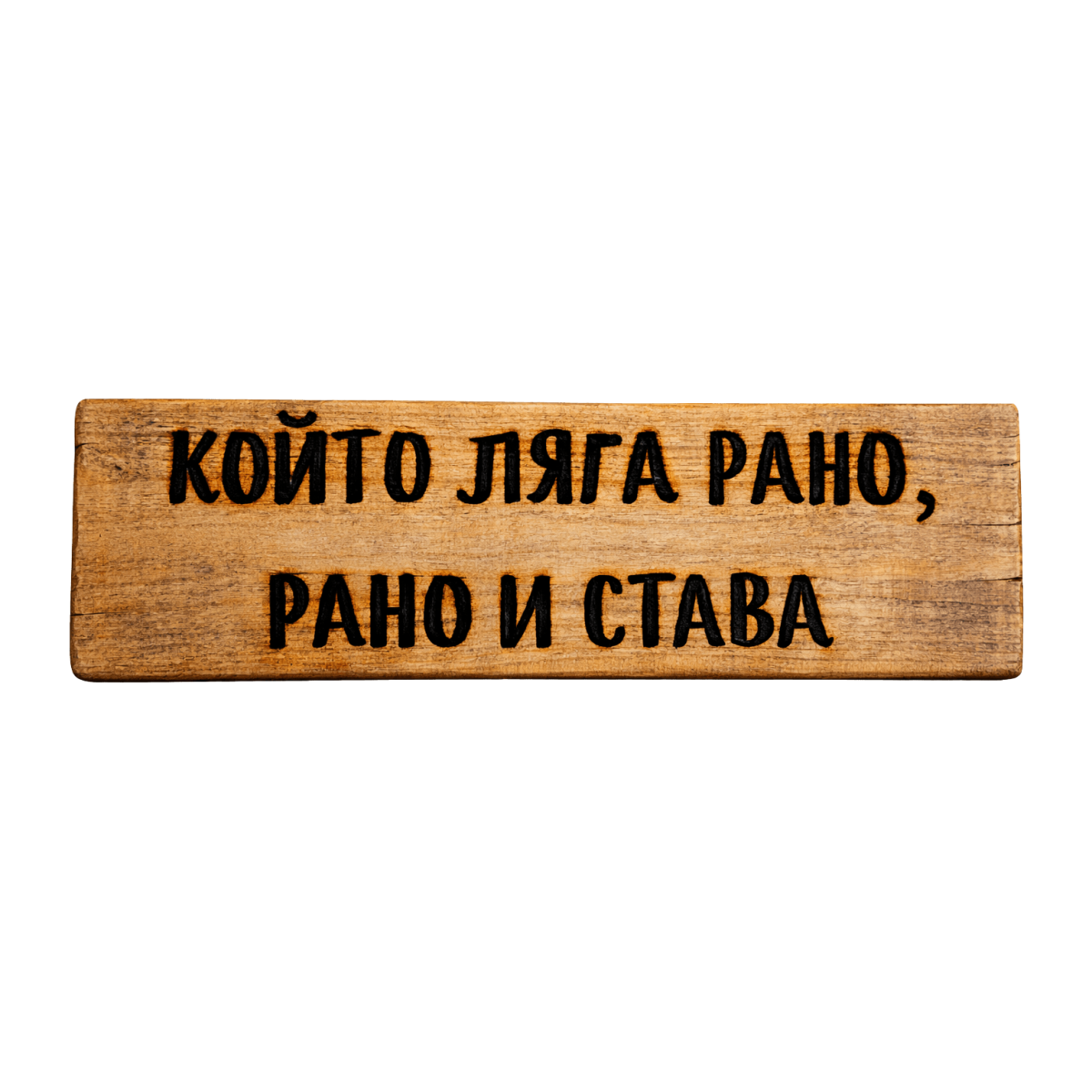 Тази ръчно изработена табела с надпис „Който ляга рано, рано и става“ е перфектен декор за хора, които обичат дисциплината, ранното ставане или просто се шегуват с това. Стои чудесно на стена или врата и е отлична идея за подарък на работлив и организиран човек.