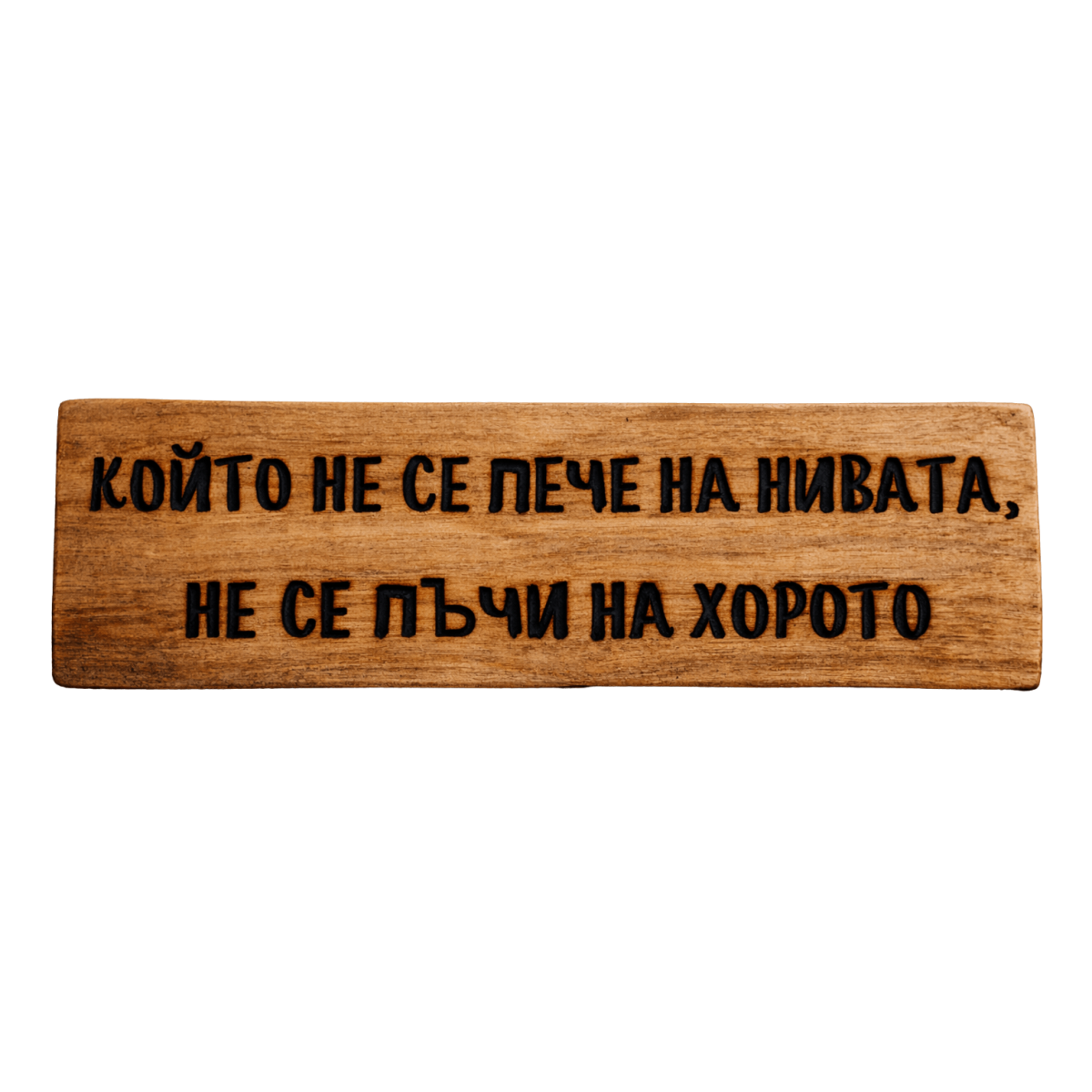 Табела „Който не се пече на нивата, не се пъчи на хорото“ е забавен начин да напомним, че успехът и радостта идват с труда. С усмивка и леко намигване, тя показва, че който работи и се труди, заслужава да се радва и да се показва.  Ръчно изработена от дърво, табелата е чудесен акцент за дома, градината или кът за почивка, идеален подарък за любим човек, който цени шегата и народната мъдрост.