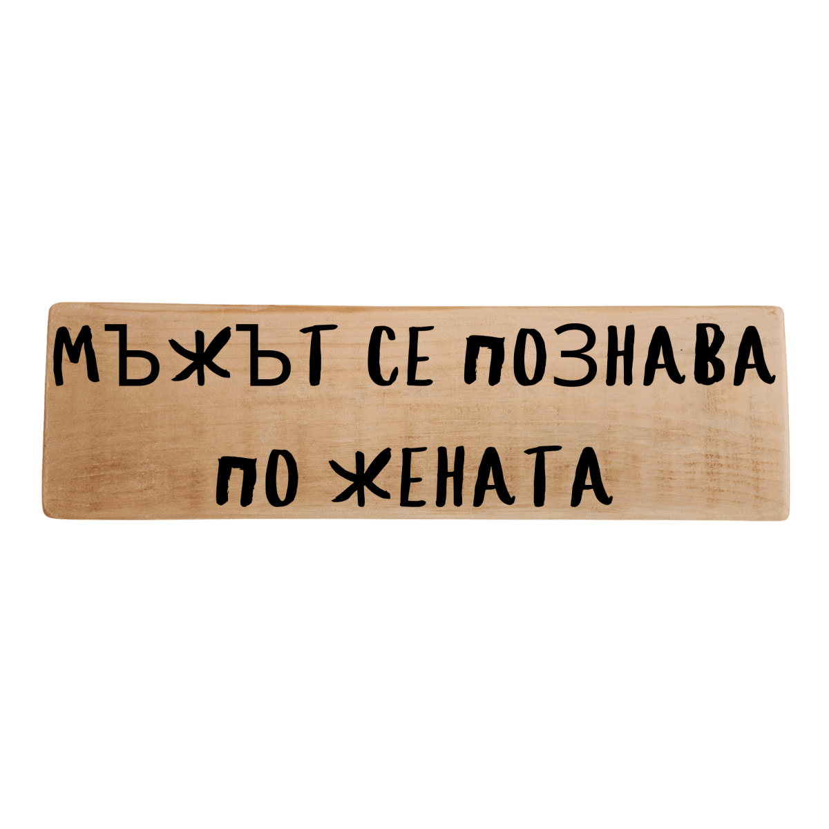 Ръчно изработена табела „Мъжът се познава по жената“ – кратък надпис с голям смисъл, който винаги предизвиква коментари. Перфектна е за дом с настроение, в който се ценят традициите и добрите взаимоотношения.