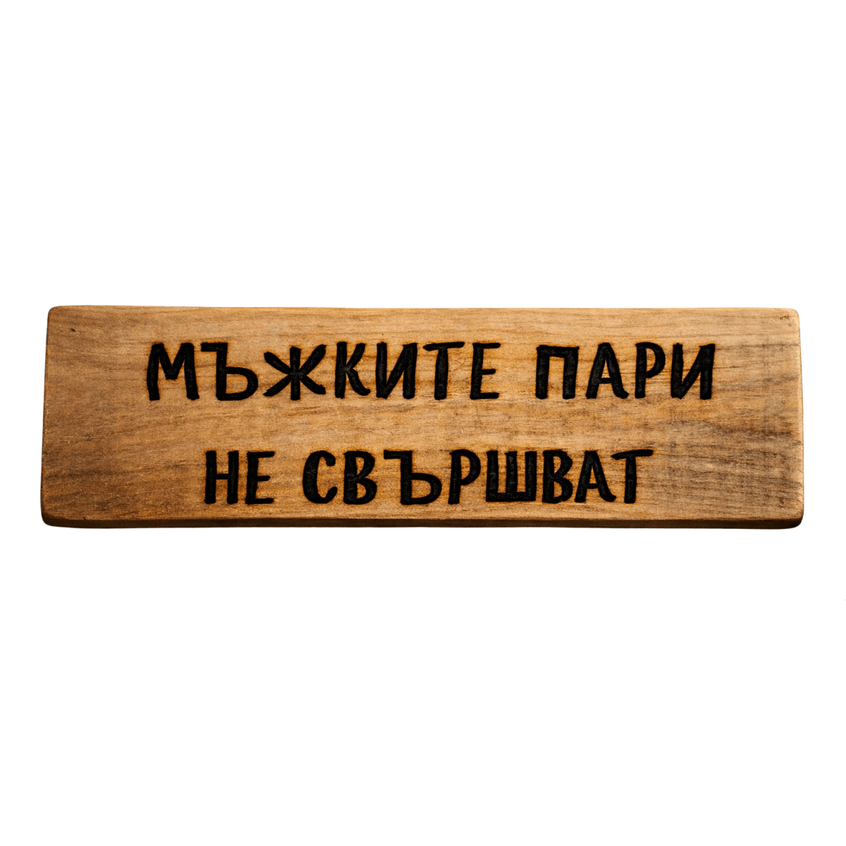 Тази табела „Мъжките пари не свършват“ е шеговита философия за портфейла и егото. Идеален подарък за мъж, който винаги намира „още малко“ за добра компания.