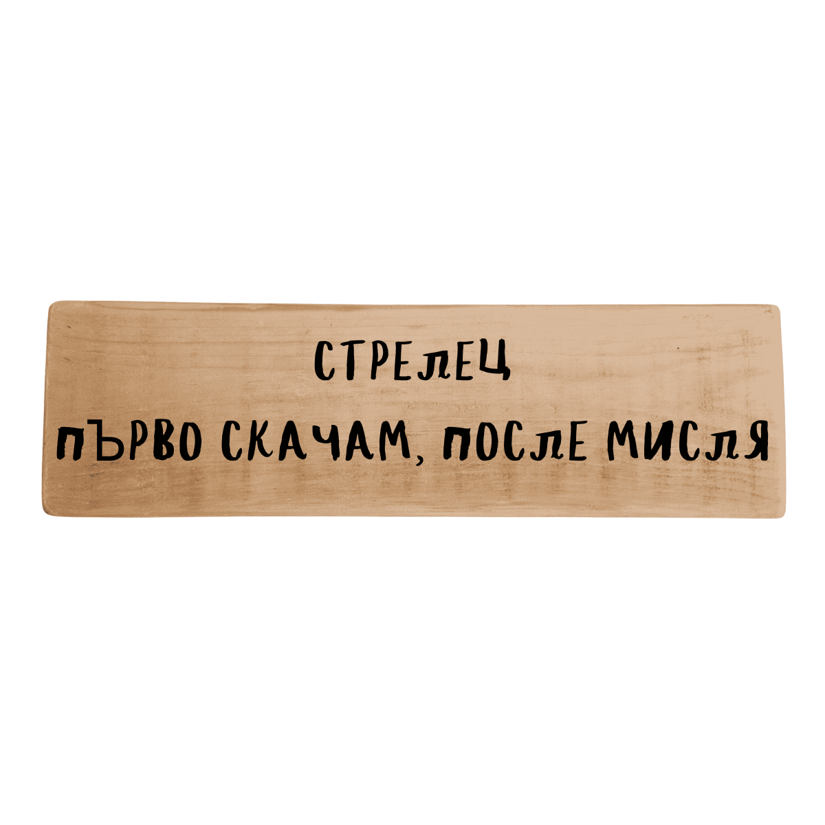 Тази дървена табела за зодия Стрелец с надпис „Първо скачам, после мисля“ описва с хумор импулсивния характер, жаждата за нови преживявания и живота без задръжки. Оригинален подарък и декорация за личности с приключенска душа, спонтанност и смелост да действат преди да се страхуват.