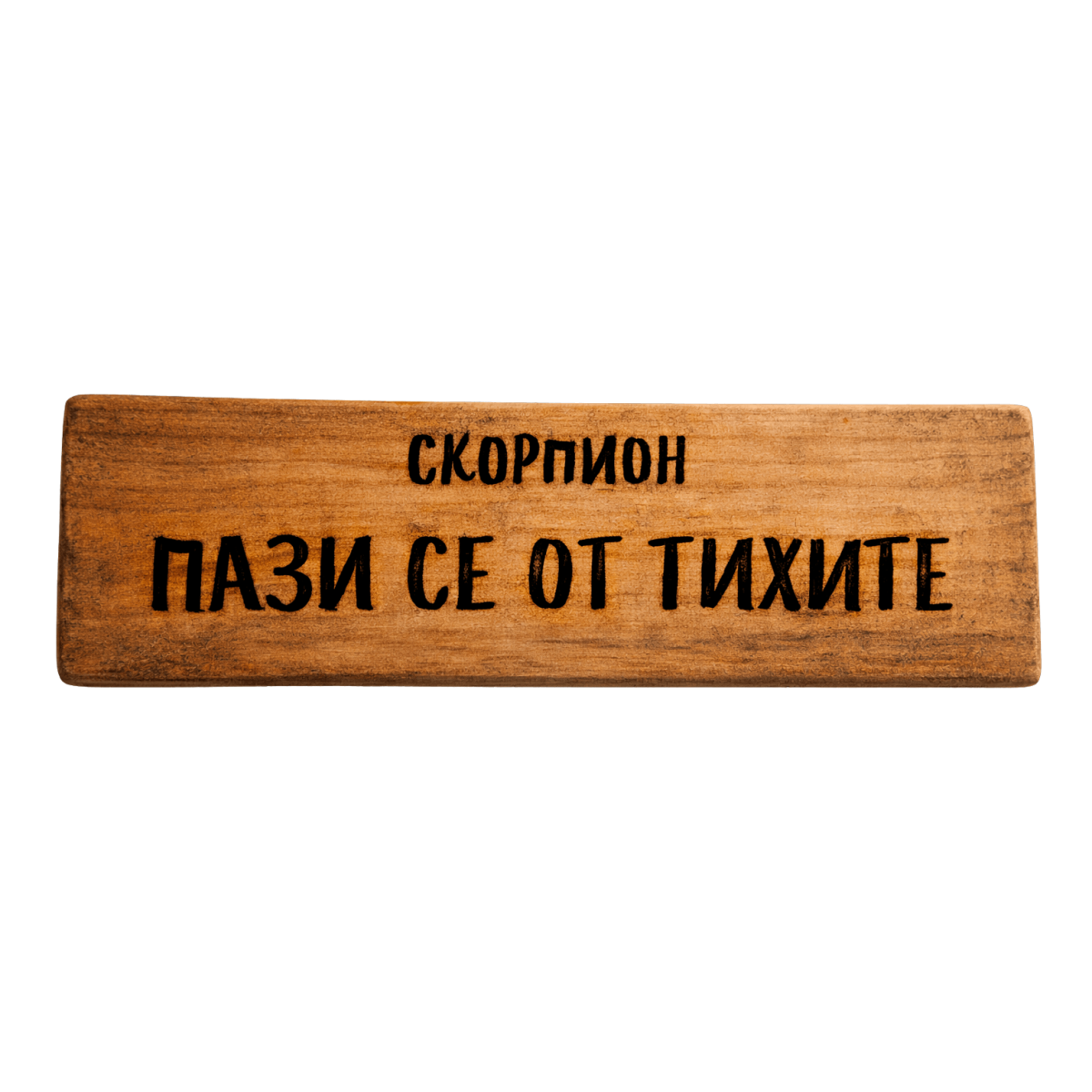 Дървена табела за зодия Скорпион с надпис „Пази се от тихите“ – кратко и въздействащо мото за хора с магнетично присъствие, дълбок характер и сила, която не се показва веднага. Оригинален подарък и декорация за личности с вътрешна сила, силна интуиция и характер, който говори чрез действия, не чрез шум.