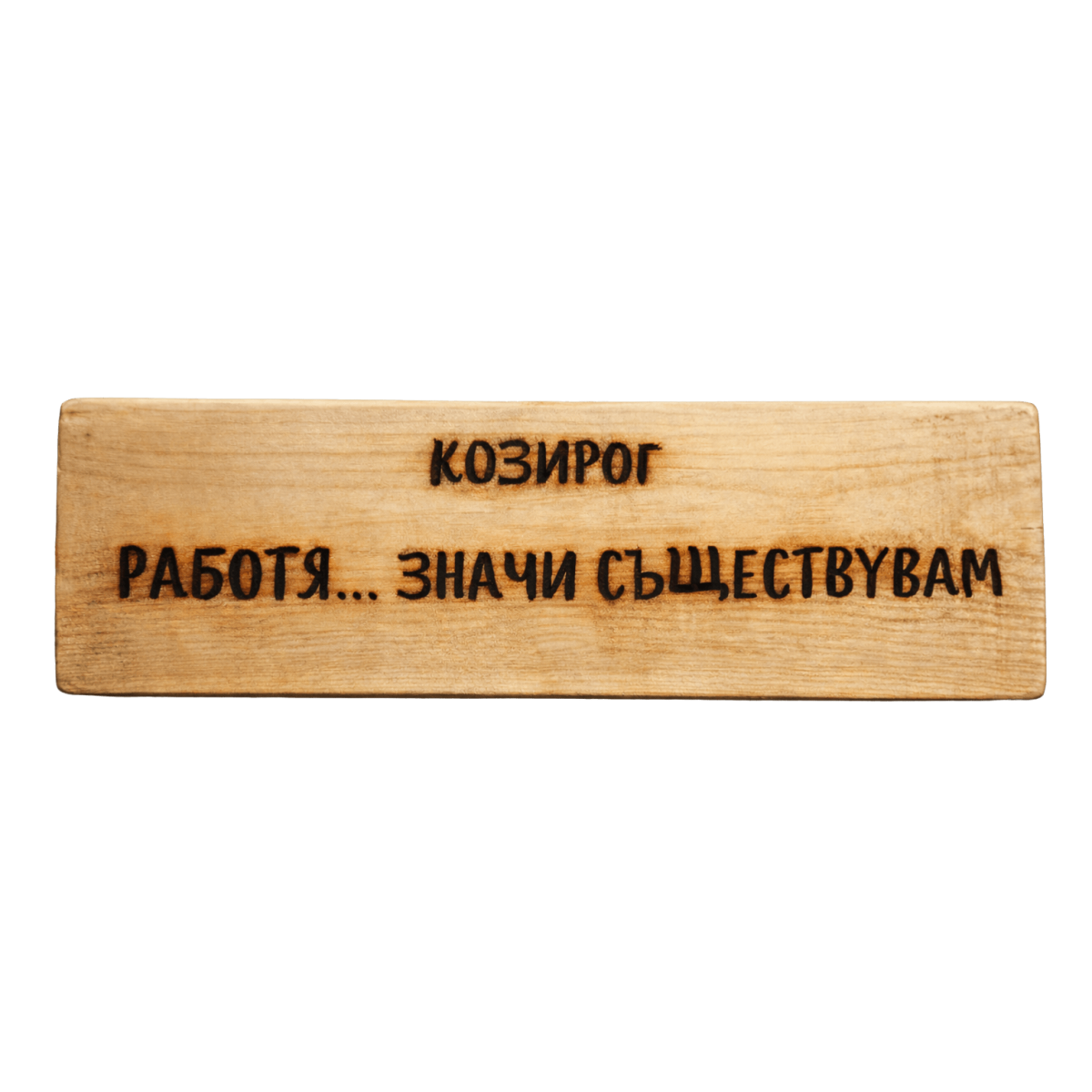 Ръчно изработена дървена табела за зодия Козирог с надпис „Работя… значи съществувам“ – закачливо мото, което отразява трудолюбието, амбицията и постоянството на този земен знак. Оригинален подарък и декорация за личности с амбиция, силна воля и естествен стремеж към успех и стабилност.