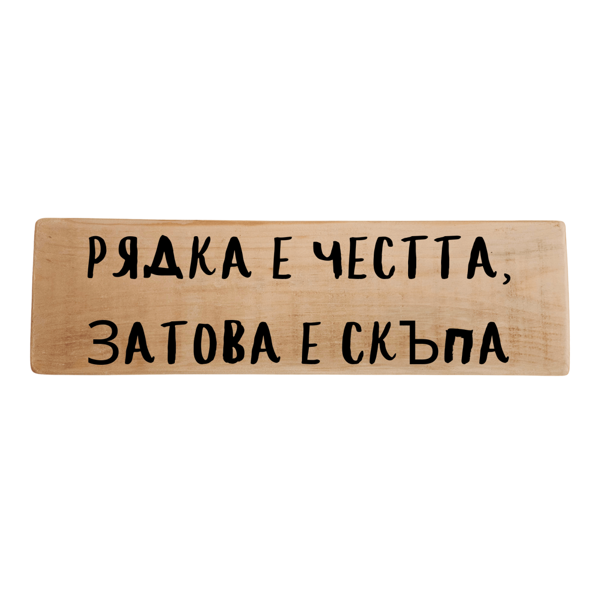 Табела „Рядка е честта, затова е скъпа“ носи ясно и мъдро послание за ценностите, които не се намират лесно и не се купуват. Кратка фраза с дълбок смисъл, напомняща, че истинската чест се отстоява с дела. Ръчно изработена от дърво, табелата е силен акцент за механа, кръчма или дом с български дух. Тя добавя характер, тежест и уважение към старите истини, които остават вечни.