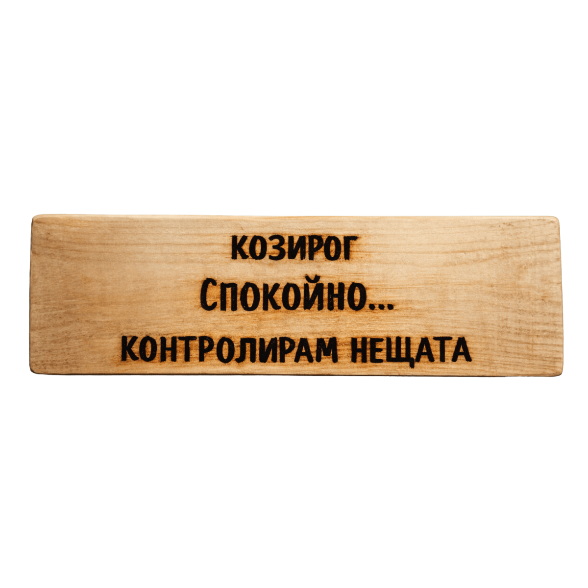 Ръчно изработена дървена табела за зодия Козирог с надпис „Спокойно… контролирам нещата“ – закачливо мото, което отразява самообладанието, отговорността и стабилния характер на този знак. Оригинален подарък и декорация за личности със стабилен характер, силна воля и естествена способност да ръководят и управляват ситуациите.