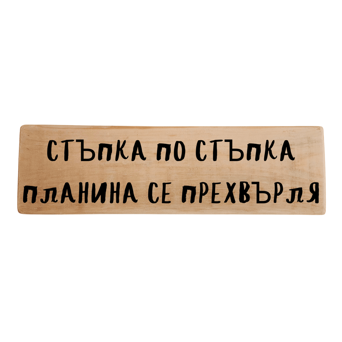 Табела „Стъпка по стъпка планина се прехвърля“ е за приключенци, които знаят, че всяко голямо постижение започва с първата крачка. Тя напомня, че търпението, постоянството и вярата в пътя водят до върха. Ръчно изработена от дърво, табелата е подходяща за планинари, акцент за хижи, кътове за екипировка или дом, вдъхновявайки към движение напред, независимо от трудностите.