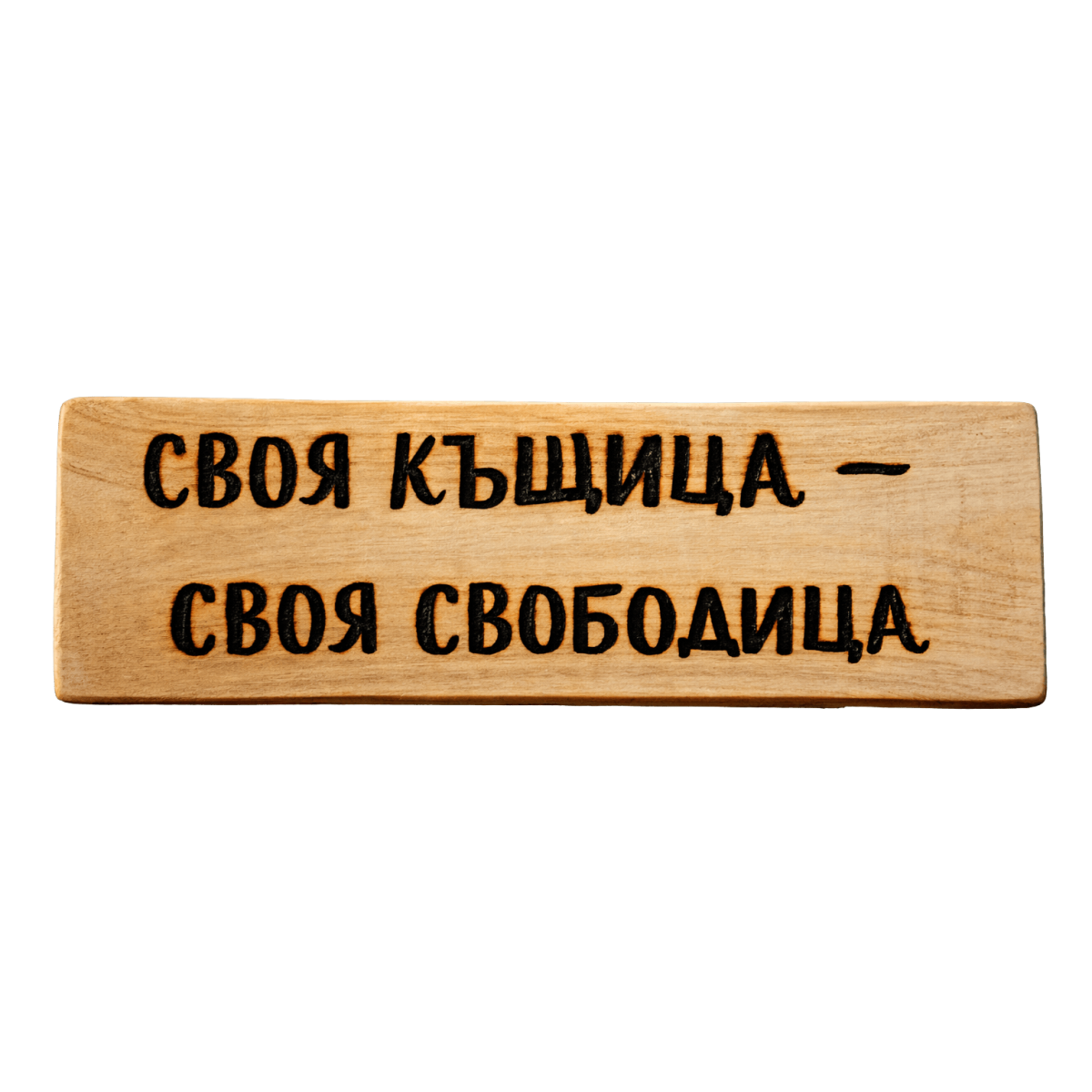 Ръчно изработена табела с надпис „Своя къщица - своя свободица“ – мило и много истинско послание за радостта от собствения дом. Подходяща е за входа, коридора или семейния кът и носи онова усещане за спокойствие, уют и свобода.
