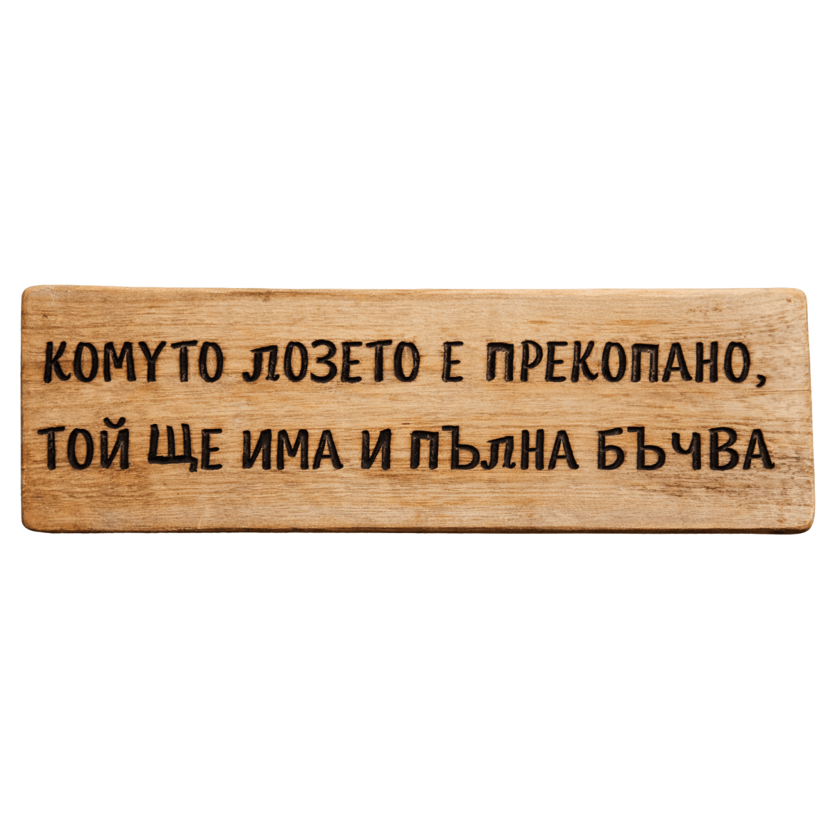 Табела „Комуто лозето е прекопано, той ще има и пълна бъчва“ носи ясното и мъдро послание, че трудът винаги се отплаща. С топлина и народна мъдрост тя напомня, че грижата, постоянството и усилията водят до изобилие и удовлетворение. Ръчно изработена от дърво, табелата е подходящ акцент за дома, двора, избата или лозето и е чудесен подарък за човек, който цени труда, традициите и плодовете на добре свършената работа.