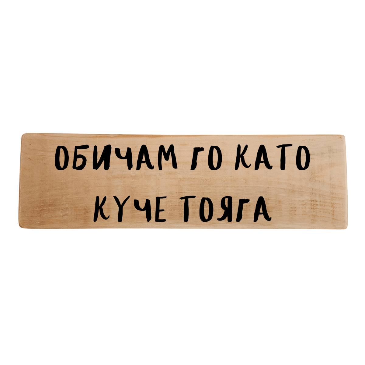 Табела „Обичам го като куче тояга“ е шеговит начин да кажеш „обичам те до полуда“ – с много чувство за хумор и без капка захаросване. Тя е за двойки, които знаят, че истинската любов върви ръка за ръка със закачката. Ръчно изработена от дърво, табелата е забавен акцент за дома и стои перфектно в комплект с „Обичам я като куче тояга“, защото любовта е най-хубава, когато е взаимна… и с чувство за хумор.