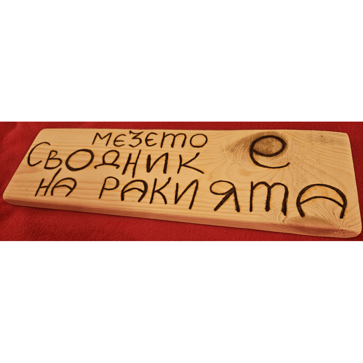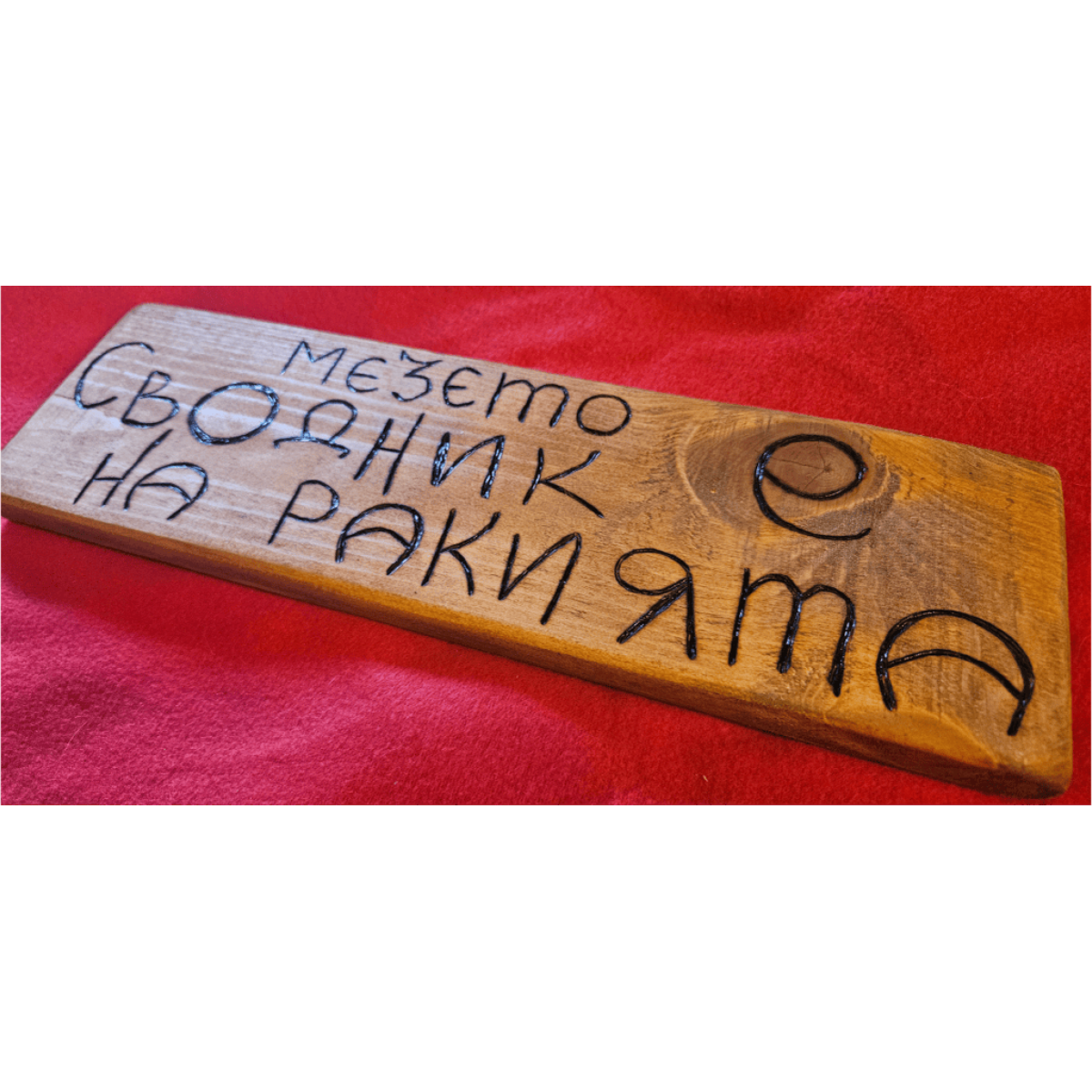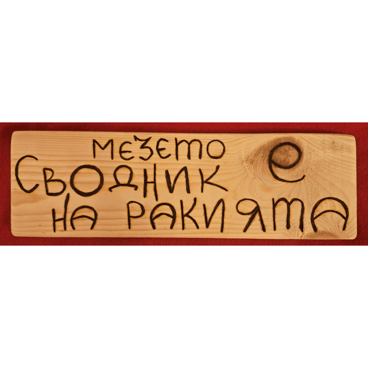 Ръчно изработена табела с надпис „Мезето е сводник на ракията“ – класически механджийски хумор, който веднага вдига настроението. Подходяща е за механа кът, лятна кухня или трапезария, където компанията е добра, а масата винаги е пълна.