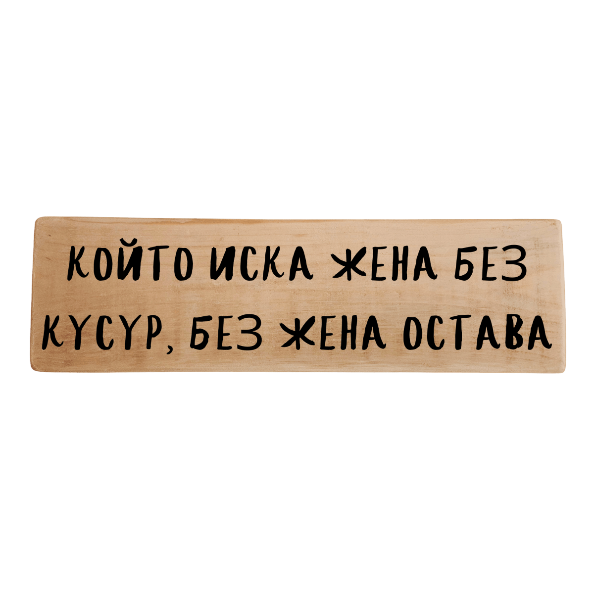 Ръчно изработена табела „Който иска жена без кусур, без жена остава“ – закачливо послание с лек житейски урок. Страхотен избор за подарък на приятел, младоженци или всяка двойка, която умее да се смее и на себе си.