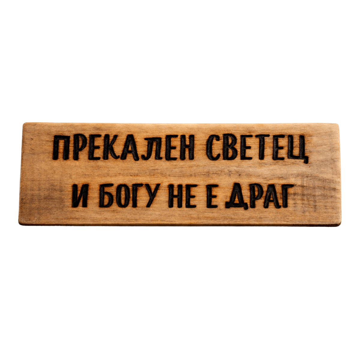 Ръчно изработена табела с надпис „Прекален светец и Богу не е драг“ – закачлив лаф за хората, които уж са безгрешни… ама малко прекаляват. Идеална е за място с чувство за хумор, където шегите са директни.