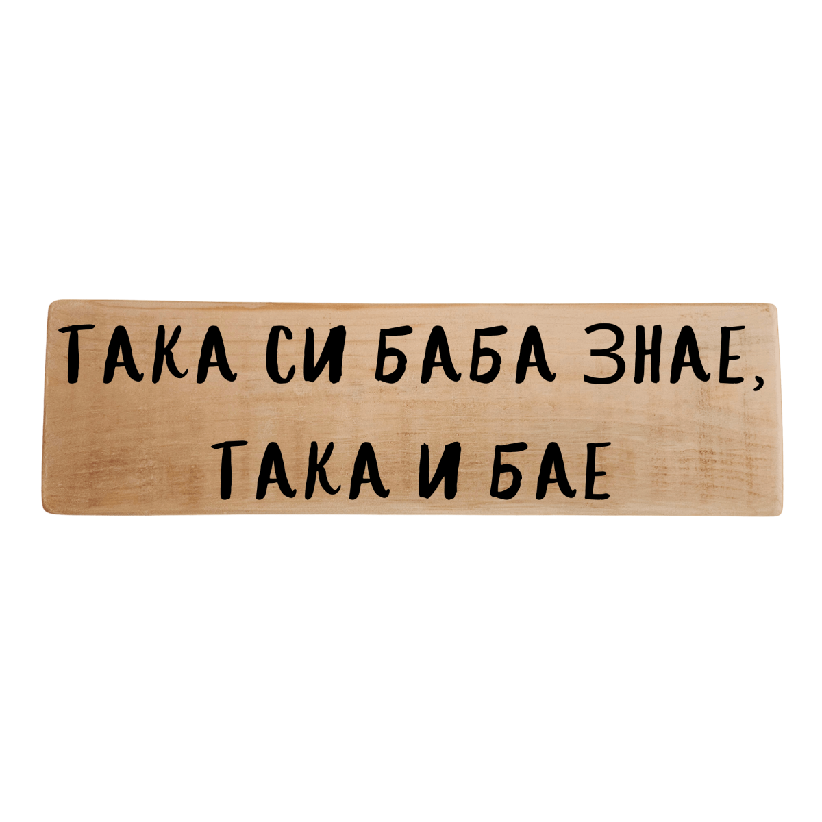 Табела „Така си баба знае, така и бае“ е забавен начин да се покаже, че опитът и интуицията на възрастните не са за подценяване. С леко намигване и усмивка, тя напомня, че мъдростта идва с годините, а решенията на „старите“ често се оказват правилни. Ръчно изработена от дърво, табелата е чудесен акцент за дома, кът за почивка или подарък за любим човек, който цени хумора и народната мъдрост.