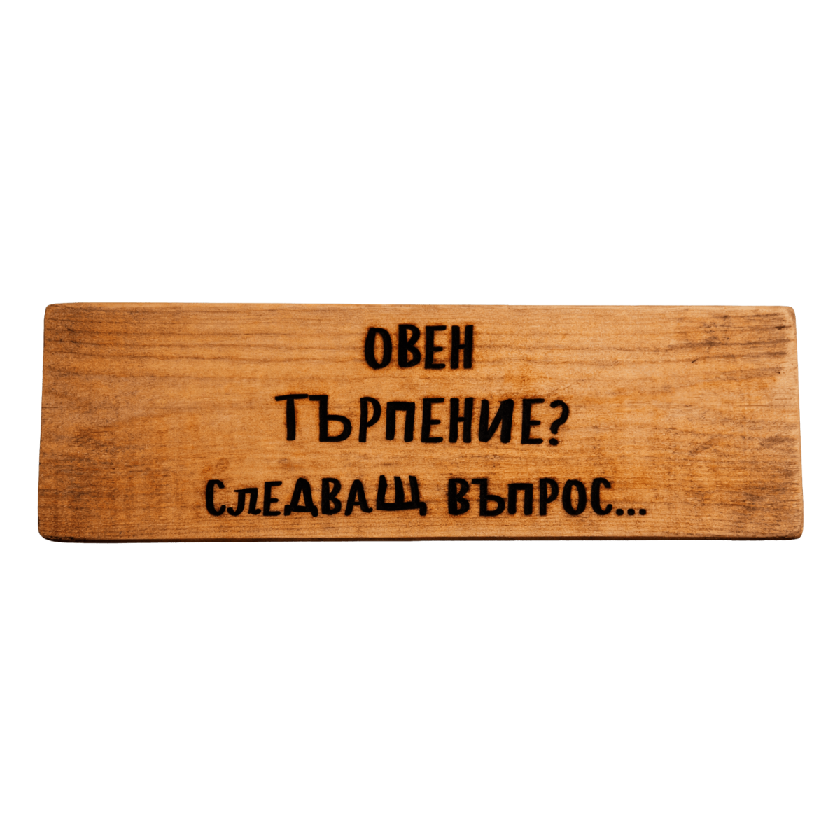 Дървена табела за зодия Овен с надпис „Търпение? Следващ въпрос…“ – кратко и остроумно мото за хора с огнен темперамент, силна енергия и живот на високи обороти. Оригинален подарък и декорация за личности с бурна енергия, импулсивен характер и желание всичко да се случва бързо и с действие.