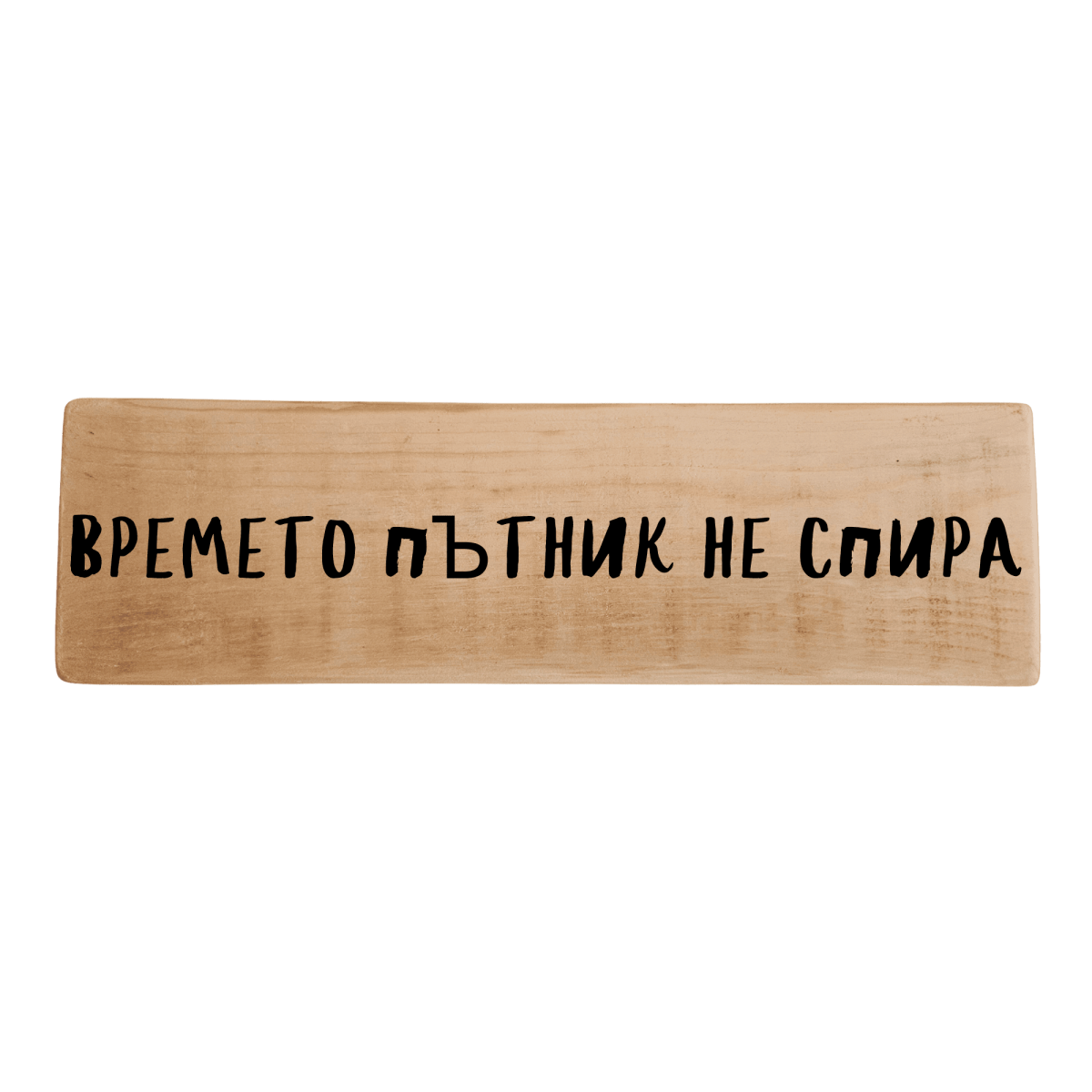 Табела „Времето пътник не спира“ е за приключенци, които знаят, че всяка стъпка носи ново предизвикателство и всяка минута трябва да се преживее пълноценно. Това е напомняне, че времето тече, но спомените и изживяванията остават завинаги. Ръчно изработена от дърво, табелата е чудесен акцент за дом, хижи или кътове за екипировка , добавяйки дух на движение, свобода и откривателство.
