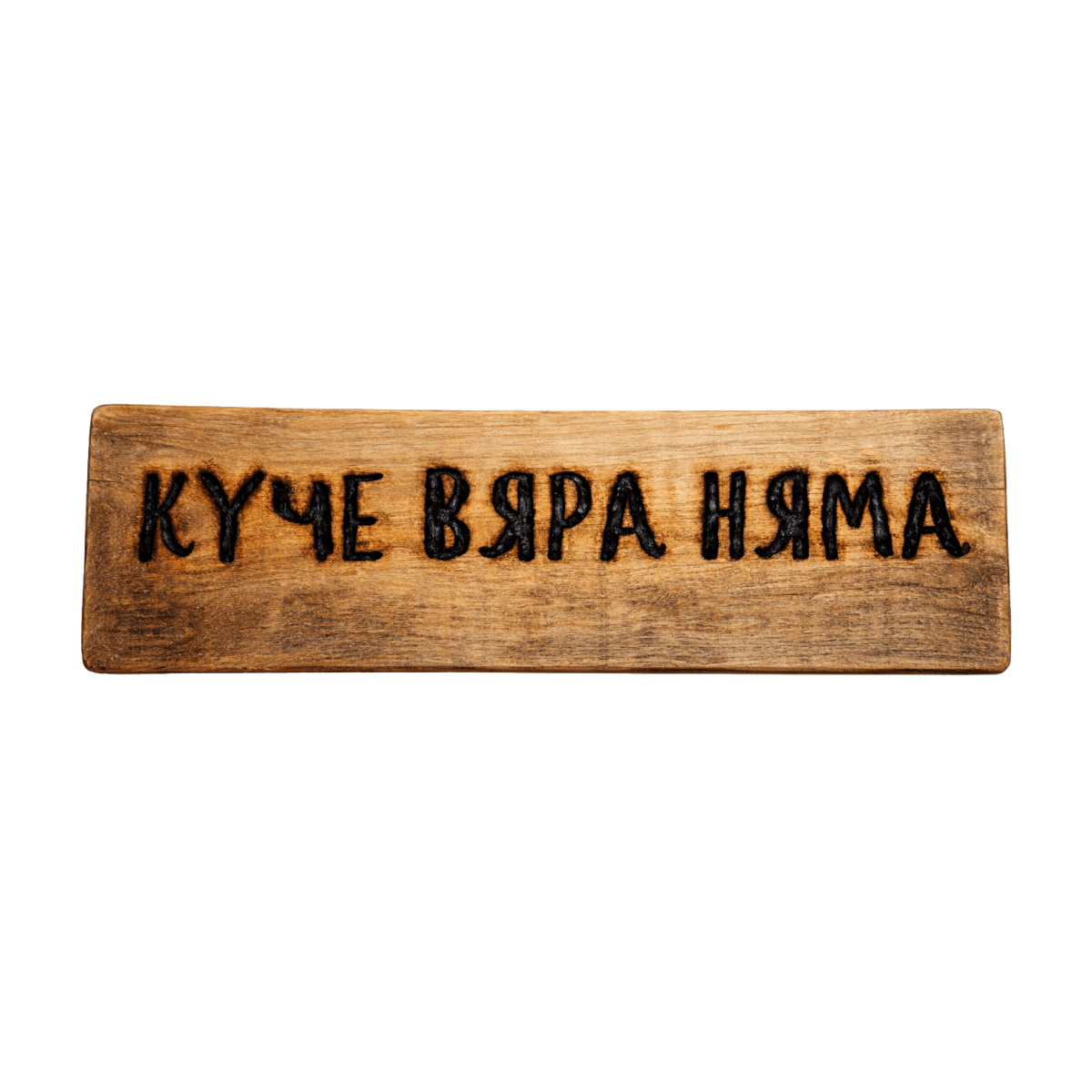 Тази ръчно изработена табела с надпис „Куче вяра няма“ е оригинален подарък за човек с чувство за хумор и малко недоверие към света. Стои чудесно като декор и винаги предизвиква реакции и усмивки.