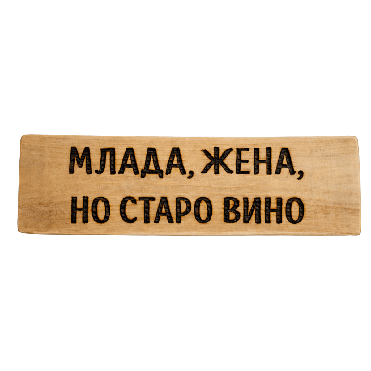 Тази ръчно изработена табела с надпис „Млада жена, но старо вино“ е оригинален подарък с намигване и български дух. Стои чудесно като декор и винаги предизвиква усмивки и закачливи разговори.