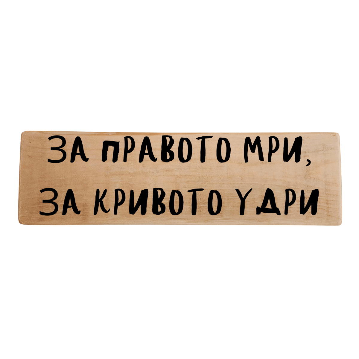 Табела „За правото мри, за кривото удри“ носи силата на българската народна мъдрост и непоколебимия характер на старите времена. С ясно и категорично послание, тя е символ на чест, справедливост и смелост. Ръчно изработена от дърво, табелата е идеален акцент за механа, кръчма или пространство с традиционен български дух. Тя напомня за ценностите, които не се договарят – правдата, честта и силата на думата.