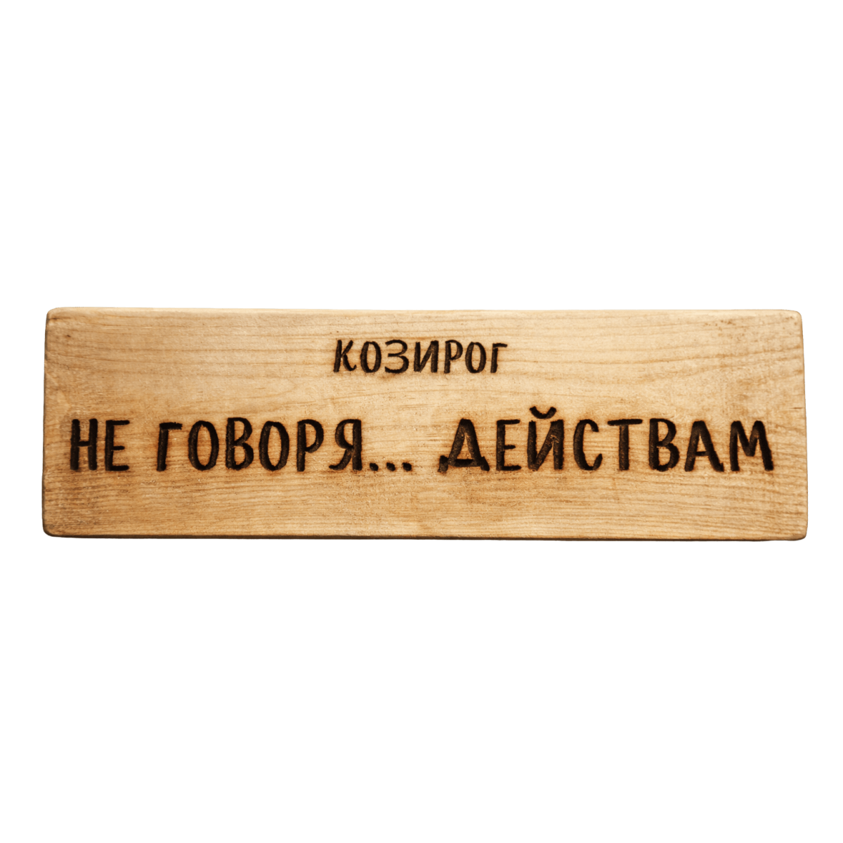Ръчно изработена дървена табела за зодия Козирог с надпис „Не говоря… действам“ – закачливо мото за хора, които предпочитат резултатите пред приказките. Оригинален подарък и декор за хора със стабилен характер, силна воля и навик първо да постигат, а после да говорят.